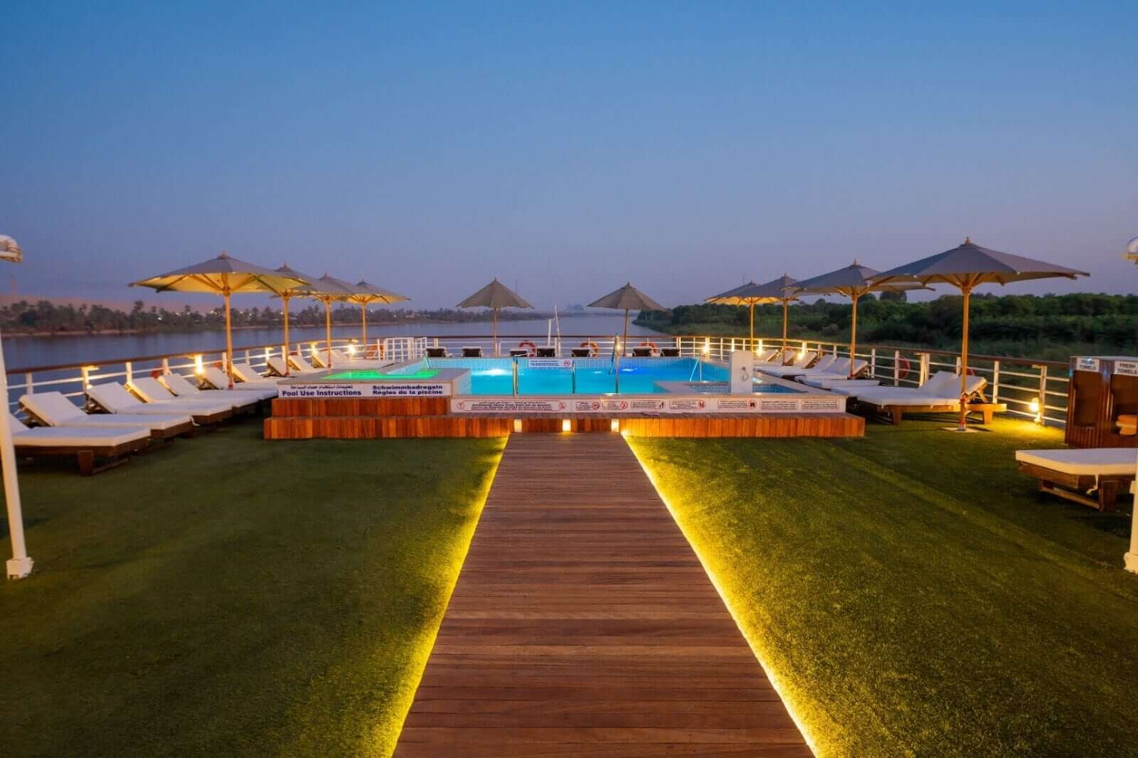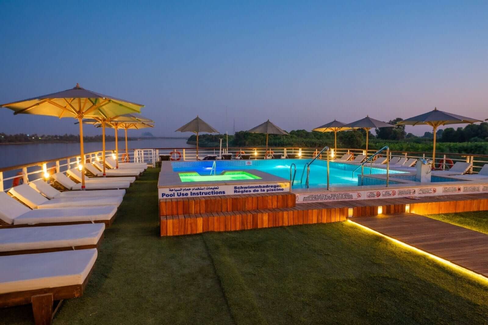 Guests enjoy spacious cabins with private French balconies, providing uninterrupted views of the Nile as you sail past Egypt’s most iconic landscapes. The expansive sundeck, one of the largest on the river, features a swimming pool and Jacuzzi, perfect for relaxing under the Egyptian sun. The luxurious lounge bar, with panoramic glass windows, allows you to unwind with a drink while taking in the ever-changing scenery.